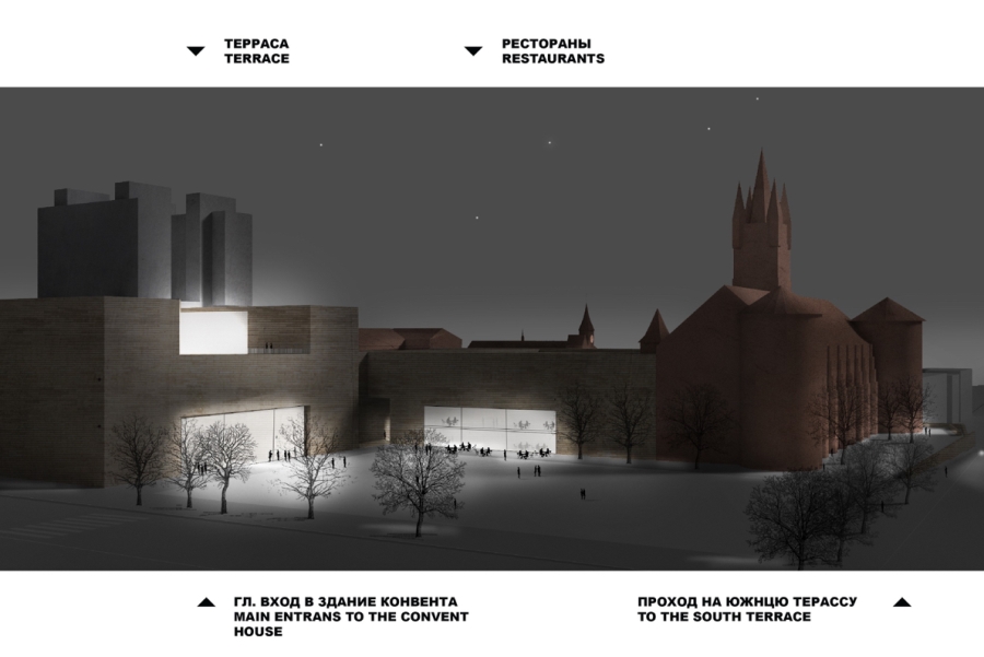 — Наверное, здание Конвента, потому что сама идея вынести его за пределы контура замка была достаточно радикальной, и когда я смотрел на этот проект сверху, в плане, я думал, что странная штука получается, но с другой стороны, пространства, которые образуются, мне нравятся. И я долго думал, как это интегрировать, как связать все это вместе с Домом Советов. Проблема была в том, что оно (новое сооружение) не должно было быть слишком выразительным, потому что в этом случае оно начало бы перетягивать слишком много внимания от того же Западного флигеля, который является непосредственно монументом, поэтому был выбран такой стиль достаточно грубый, простой, с кирпичной стеной, большими окнами. Большой вход. Чтобы