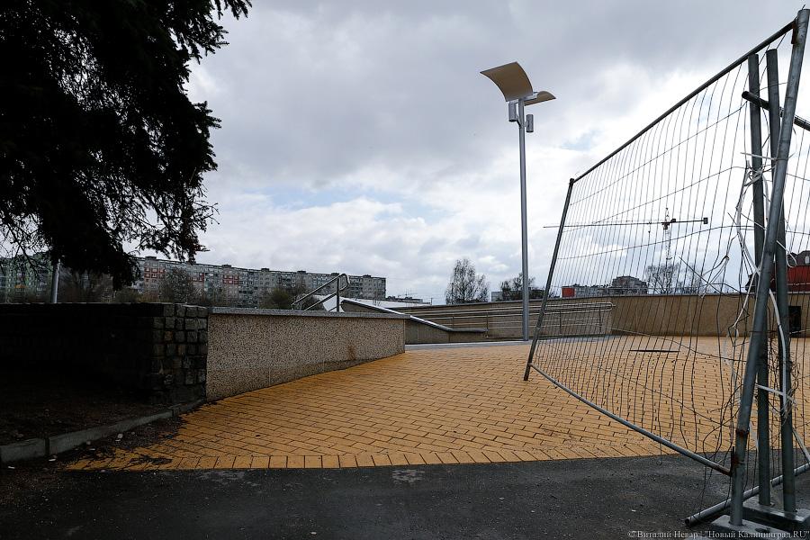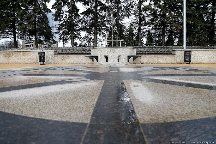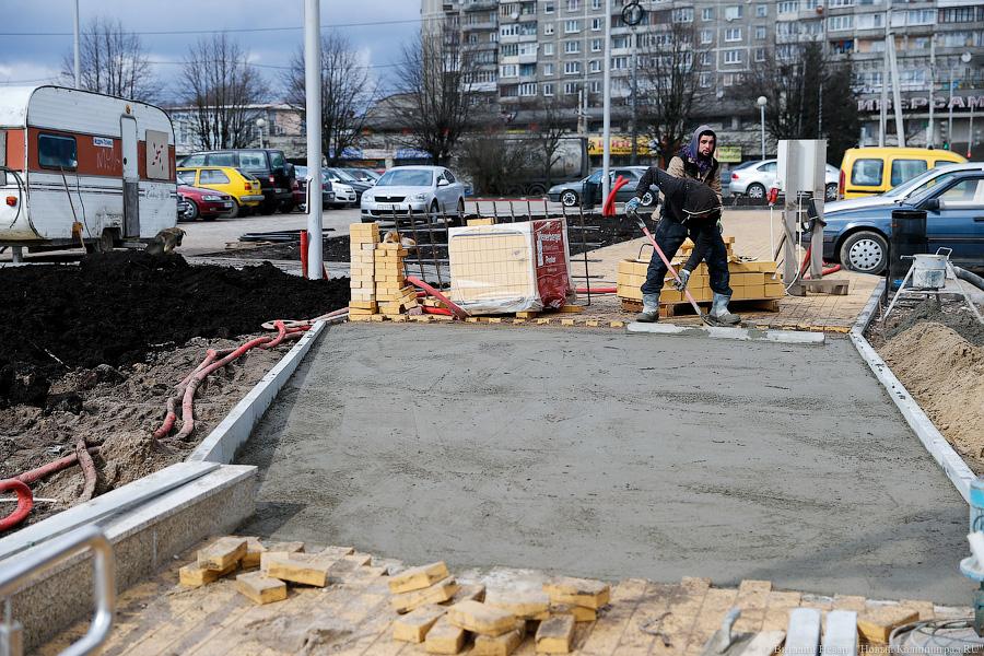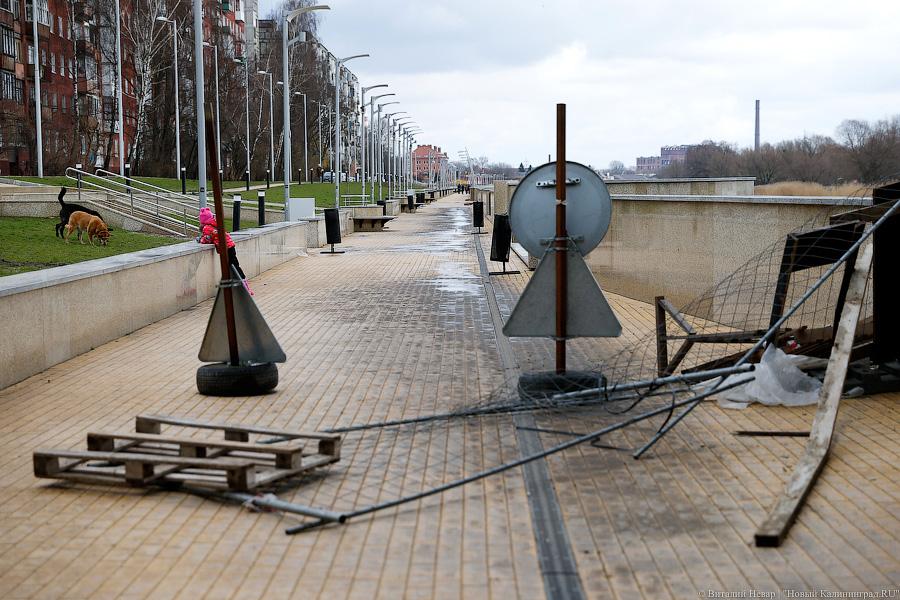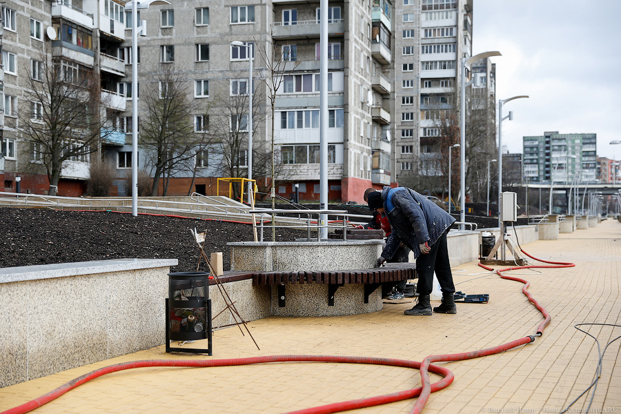 Женщины с колясками лавируют среди рабочих, устанавливающих лавки, компания калининградцев потребляет крепкие напитки около накренившегося памятника