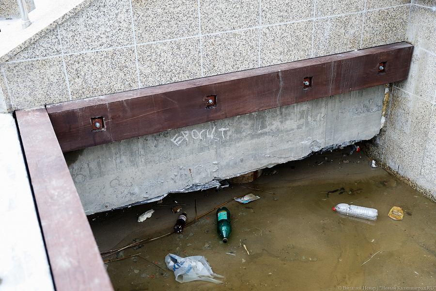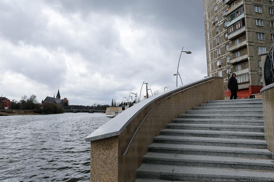 Лужа, которую в марте 2015 года корреспонденту «Нового Калининграда.Ru» показывала местная жительница Нина Яковлевна, похоже, не высохнет уже никогда. Более того, эта лужа разрослась и поглотила 40% всей набережной. «Я это так не оставлю! Здесь к 2018 году будет яма на яме! Пусть меня называют занудой, но я это называю гражданской позицией, — говорила она. — Это деньги, которые мне недоплатили в качестве пенсии, это деньги, которые я переплачиваю после того, как цены подняли. И если мы не воткнём лицом этих строителей в их работу, ничего хорошего не получится». Женщина ошиблась в прогнозах на пару лет — ямы пришли на набережную уже в 2016-м.