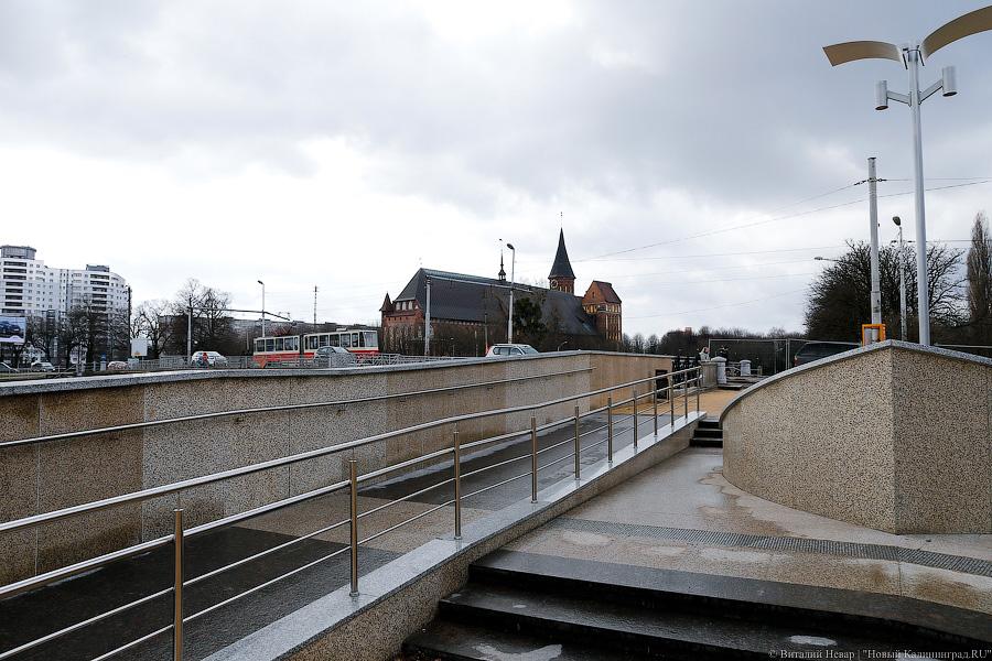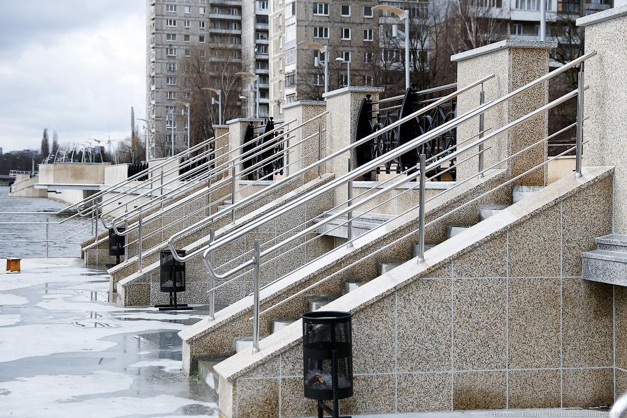 Зато после провалов и трещин на первой части вторая кажется ещё лучше и красивее. И даже почти не портит впечатление раздолбанный проезд вдоль домов (дорогой его назвать не получается никак). Местные жители, чтобы не утонуть в грязи, шагают по узкой велодорожке, на которой пока нет разметки, да и велосипедистов тоже. Спусков на новую часть набережной мы насчитали 5. Пандуса нет только на одном, расположенном в центре. Нет пандусов и на спусках к воде — видимо, проектировщики были уверены, что инвалидам на причал не надо.