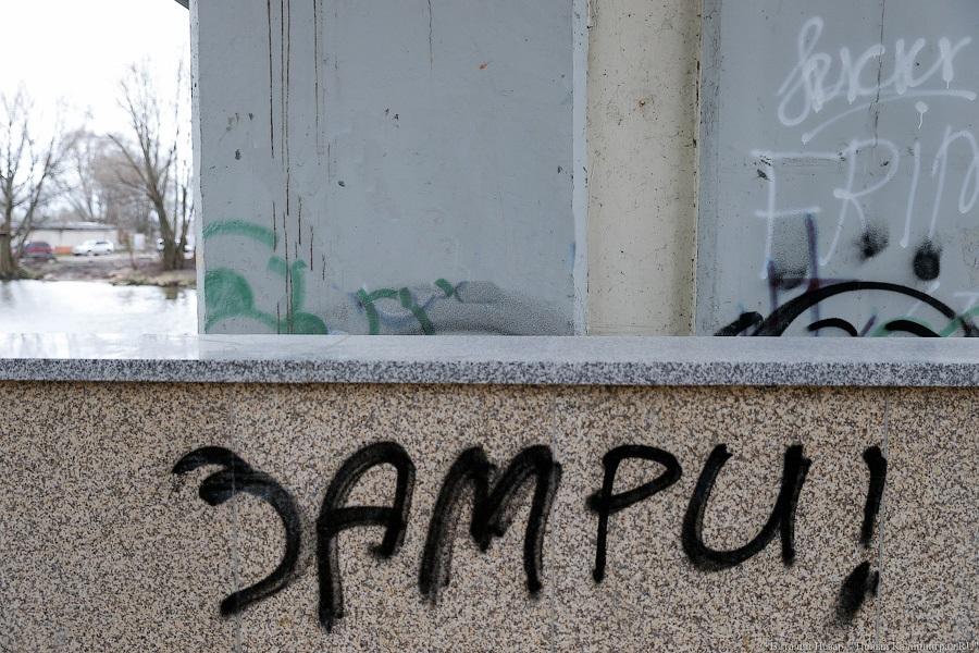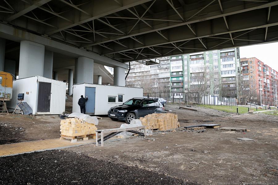 Узкая велодорожка под второй эстакадой обрывается — её ещё не соединили с первой частью. Зато по самой набережной под мостом можно пройти спокойно, хотя и тут уже побывали вандалы — на свежем граните уже красуется надпись «Замри». Неизвестно, что хотел сказать этим автор, но замирать в этом месте особо не хочется — под мостом громоздятся горы строительного мусора, а дальше начинается первая часть набережной, построенная год назад.