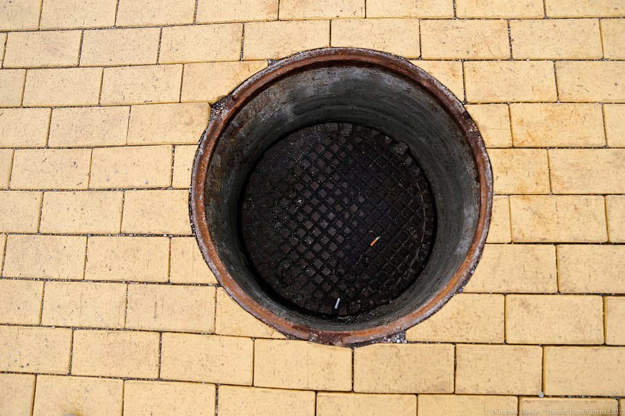 В целом вся вторая часть Трибуца производит впечатление огромной работы над ошибками первой части. Лавки поставлены другие (и на них нет трещин), уклоны и парапеты сделаны так, что грязь не стекает прямо на прогулочную зону, ливневки не расположены выше уровня покрытия, плитка под ногами не «гуляет», урны стоят, фонари работают. Правда, прямо на входе со стороны Октябрьской встречает открытый люк. Ну, не совсем открытый — просто крышка в нём