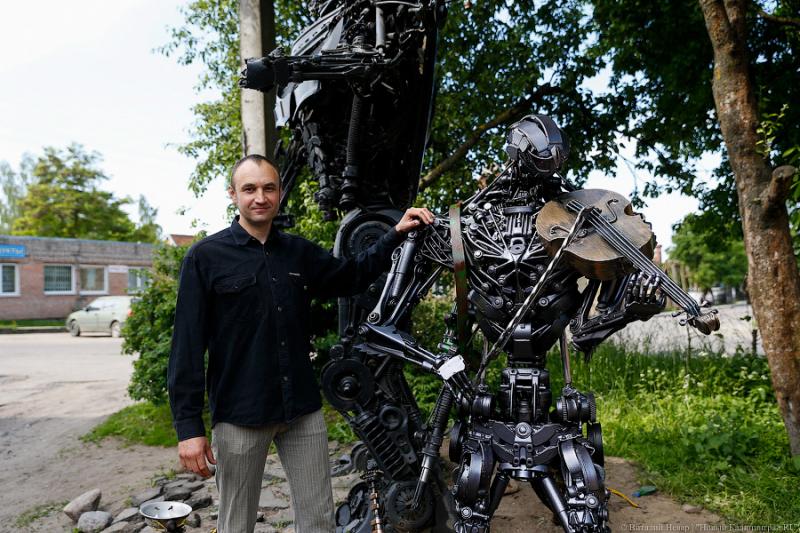 Мы приезжаем в Гвардейск утром, пропустив пару поворотов, находим, наконец, нужный переулок. Пешком до двора с роботами от площади — рукой подать, однако мы на машине почему-то долго не можем сориентироваться. Роботов уже пятеро — два больших и три маленьких. Первый из них — тот самый трёхметровый Малыш (3,4 метра, если быть точным) появился здесь в августе прошлого года. Канатоходца Александр установил в мае. А теперь дошла очередь и до скрипача с помощниками, один из которых исполняет роль механика (или настройщика), а второй вытянул над головой плошку, недвусмысленно намекая, что уличное искусство должно вознаграждаться. Судя по мелочи в миске, туристы с этим фактом согласны. Пока мы общаемся с автором скульптур, возле ботов всё время кто-то фотографируется или просто любуется ими, однако никто не пытается оседлать трансформеров или забрать деталь на память. Новый житель поменьше ростом, чем Малыш, однако выглядит опаснее — в нём легко угадывается хищник. Если уже сравнивать со знаменитой франшизой, то он скорее десептикон, чем автобот. У его ног воткнут топор, на плече висит то ли винтовка, то ли автомат, а сам он вдохновенно играет на скрипке. Впрочем, сам Александр слоняется к версии, что это скорее альт. Автоботы стоят во дворе немецкого дома, где живёт их создатель. В нескольких метрах — мастерская, где их создавали. Кроме Малыша, которого Александр собирал в автосервисе.