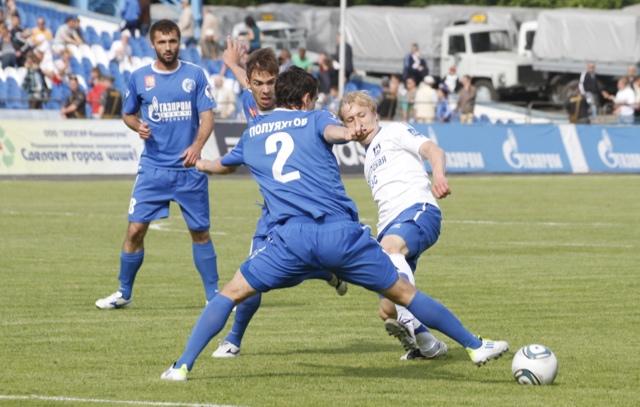 У нас на воротах Денис Пчелинцев, у "Газовика" - Леонид Мусин. Ну, они бегают по полю. Наши в беленьких маечках.