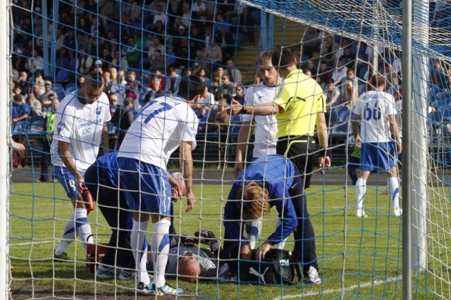 Только началась игра, а наш футболист уже получил повреждение. Но после оказанной медпомощи вернулся на поле. Имя ему Дмитрий Стоцкий.