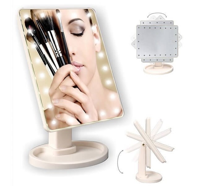 Зеркало для макияжа с LED-подсветкой — это отличный инструмент для нанесения макияжа и создания идеального мэйка. 22 светодиода обеспечивают равномерное освещение лица со всех сторон в любое время суток, что позволит вам равномерно нанести косметику, не допуская ошибок. Включить и выключить зеркало можно при помощи специальной сенсорной кнопки. Специальная подставка позволит разместить на ней различные косметические мелочи, например, губную помаду, пудру, тени для глаз или что-нибудь другое, а свободное вращение на 180° позволяет зафиксировать косметическое зеркало в удобном для вас положении. Зеркало для макияжа с LED подсветкой имеет изысканный, элегантный вид и украсит собой интерьер в доме.