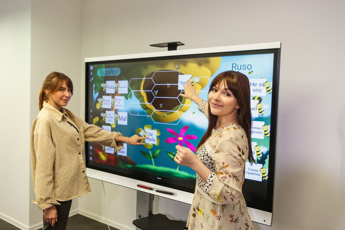 навыков (чтение, аудирование, письмо, говорение), школа использует интерактивные панели