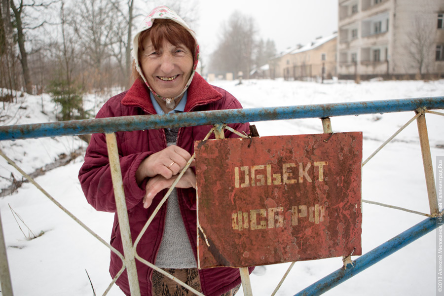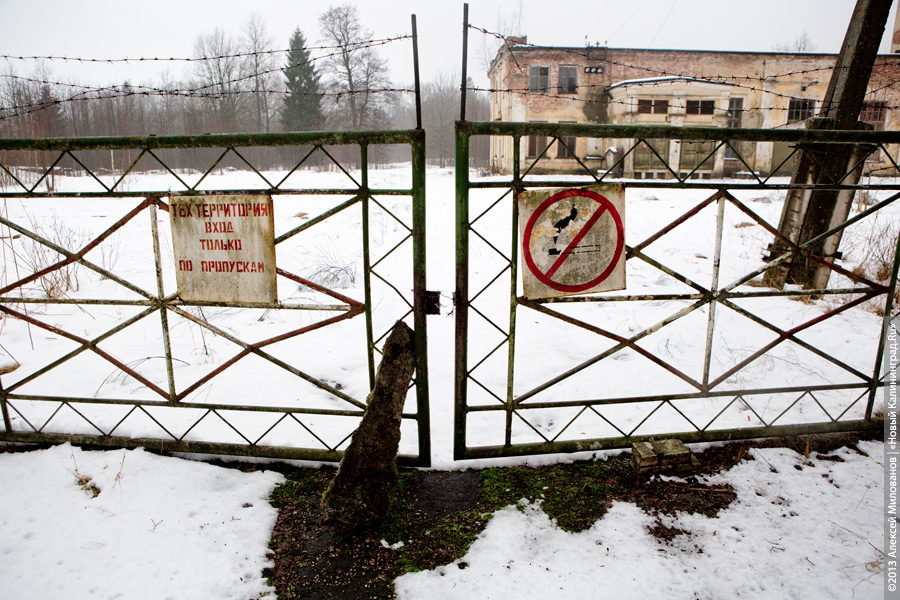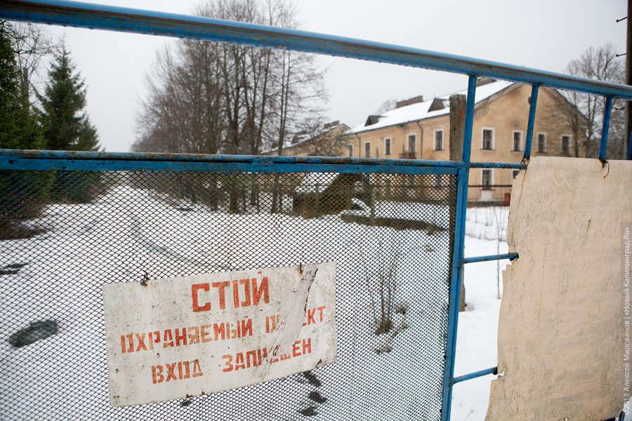 Немного не доезжая до Фрунзенского, сворачиваем на узкую брусчатую дорогу, на которой вряд ли могут разъехаться две машины. Едем по ней минут 20 и оказываемся перед поваленным деревом, загораживающим въезд на территорию бывшего военного городка. На заборе — старая табличка с надписью «Объект ФСБ». Перед нами — несколько двухэтажных аккуратных домиков с балкончиками, большая котельная, недостроенная казарма и ещё много всевозможных маленьких и не очень зданий, в которых