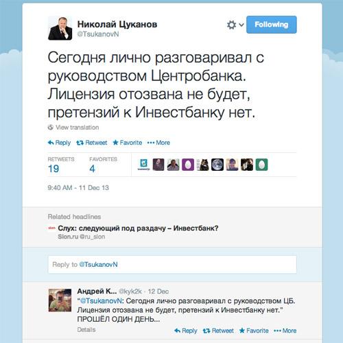 «Сегодня лично разговаривал с руководством Центробанка. Лицензия отозвана не будет, претензий к Инвестбанку нет»