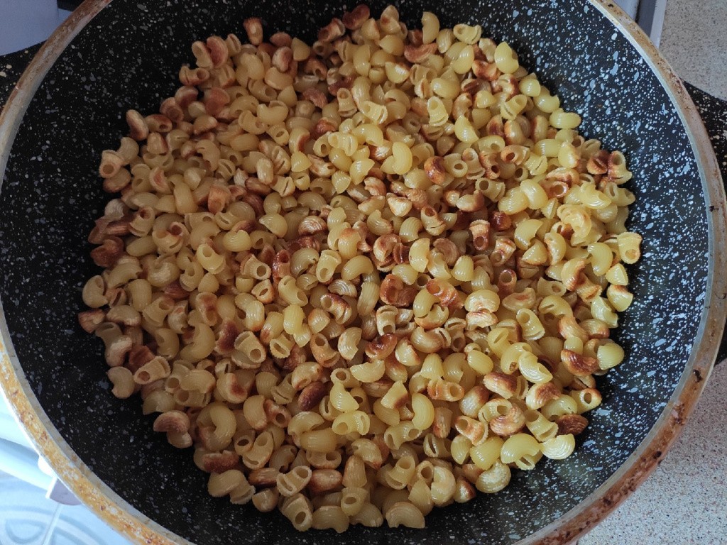 Ультрадешевые макароны очень сложно сварить до правильного состояния, чтобы они не превратились в торт, как в фильме «Берегите женщин», поэтому в студенческие годы мы поступали так: сначала жарили мелкие макароны на растительном масле до золотистой корочки, потом доливали воды, добавляли соль и приправу и так оставляли до полного испарения жидкости. За рецепт особая благодарность Елене Анатольевне Лопонос. Я решил повторить опыт приготовления десятилетней давности, но немного промахнулся со временем — передержал на огне, так что небольшая часть несильно подгорела. Несмотря на это, блюдо осталось в нужной консистенции, ничего ни к чему не прилипло, а я в два захода съел целую пачку макарон: на обед и на ужин. По выходу энергии макароны, как и тосты с яйцом, получаются привлекательными: 473 ккал, 98,7 грамм углеводов, 14,6 грамм белков, и 1,4 грамма жиров на порцию в 139 грамм блюда.