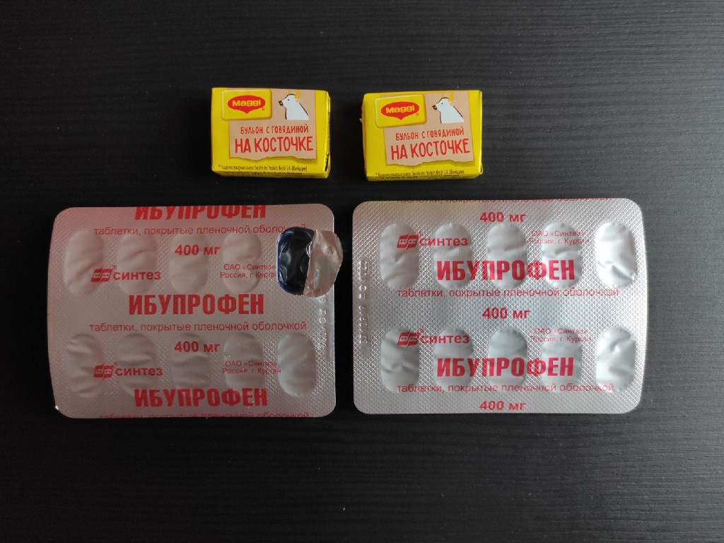 Не знаю, почему, но сегодня болела голова. Не очень сильно, но серьезно мешало работать и делать вообще хоть что-то. Так как эксперимент ещё не закончен, а на сутки у меня осталось приблизительно по 100 рублей, то появляется дилемма: комфортно добраться до дома без головной боли или топать домой пешком с головной болью, но зато обновить запас куриных яиц и кефира. Я выбрал первый вариант, правда купил еще два бульонных кубика по 4 рубля. В аптеке Ибупрофен оказался почти в 4 раза дешевле Нурофена, однако через 40 минут после приёма помог — головная боль прошла.