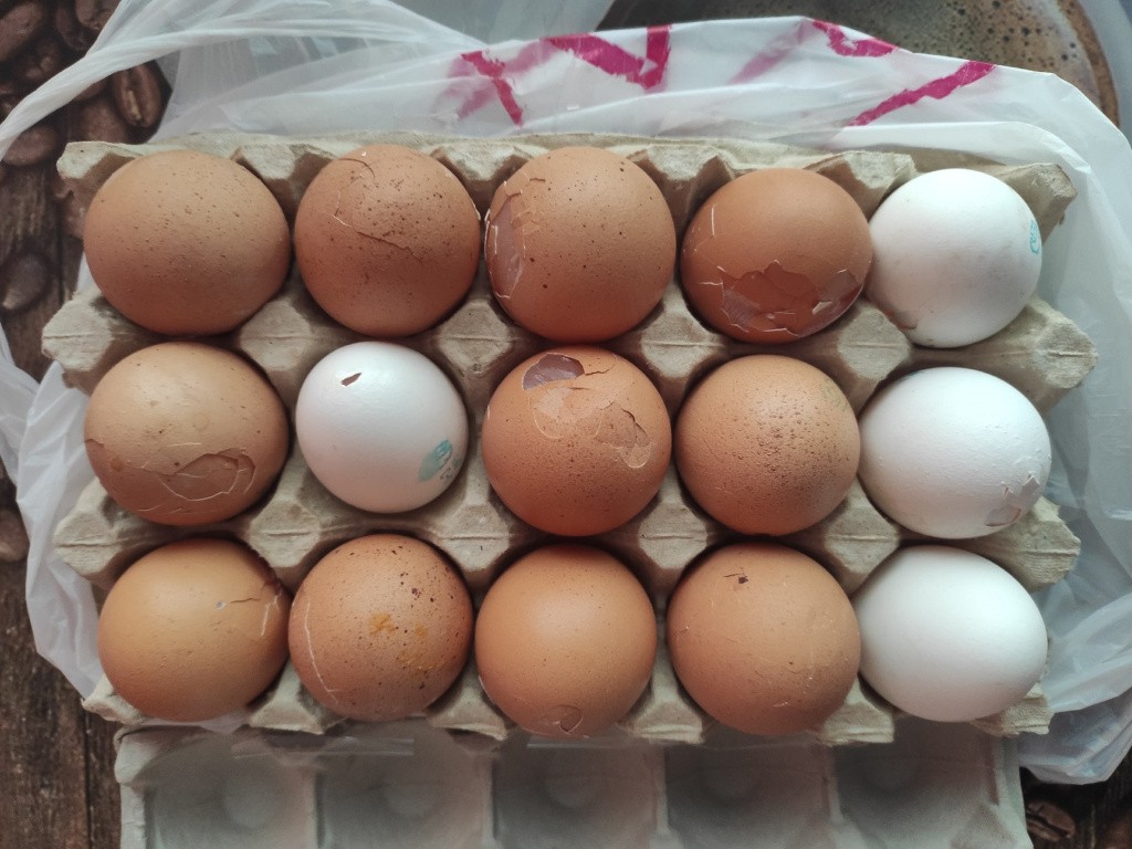 Ещё одна читательница, которая предпочла не раскрывать свою личность, предложила поделиться куриными яйцами, хотя мы вовсе не были знакомы. Она предупредила, что яйца с визуальными дефектами, но полностью подходят для употребления. Я проверил все полтора десятка: трещины в скорлупе есть, но сквозного нарушения оболочки нет не у одного — утром сделал из части яиц омлет.