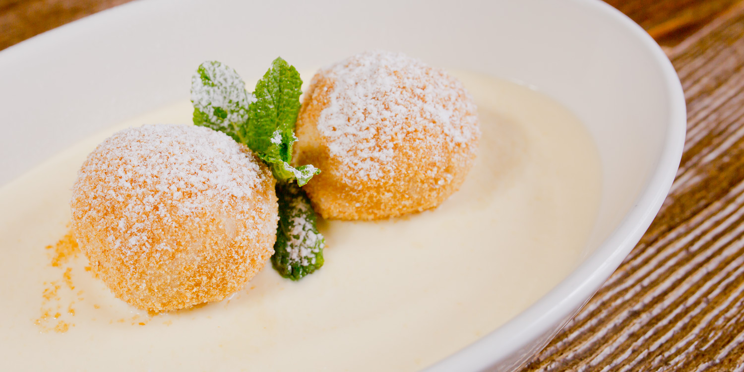 А подаются творожные шарики на подушке из нежнейшего ванильного соуса.