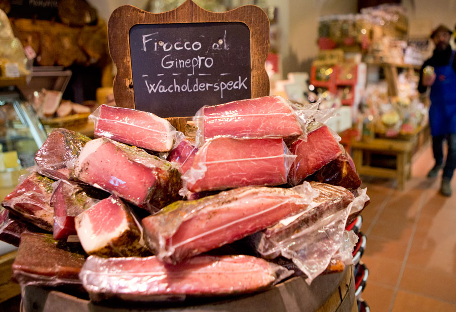 «Местный и традиционный» в отношении спека вовсе не просто слова; в соответствии с законодательством Евросоюза, копчёная свинина может называться «спек» только если была приготовлена именно в итальянском регионе Трентино — Альто-Адидже. Который также называется Южный Тироль. В городке Брунико, рядом с которым расположились калининградские путешественники, есть даже маленький магазинчик, гордо называемый «Музеем спека». Ну и, конечно, самые разные виды этого деликатеса можно найти во всех без исключения здешних продуктовых магазинах.