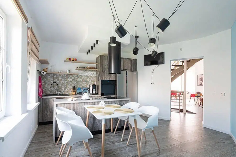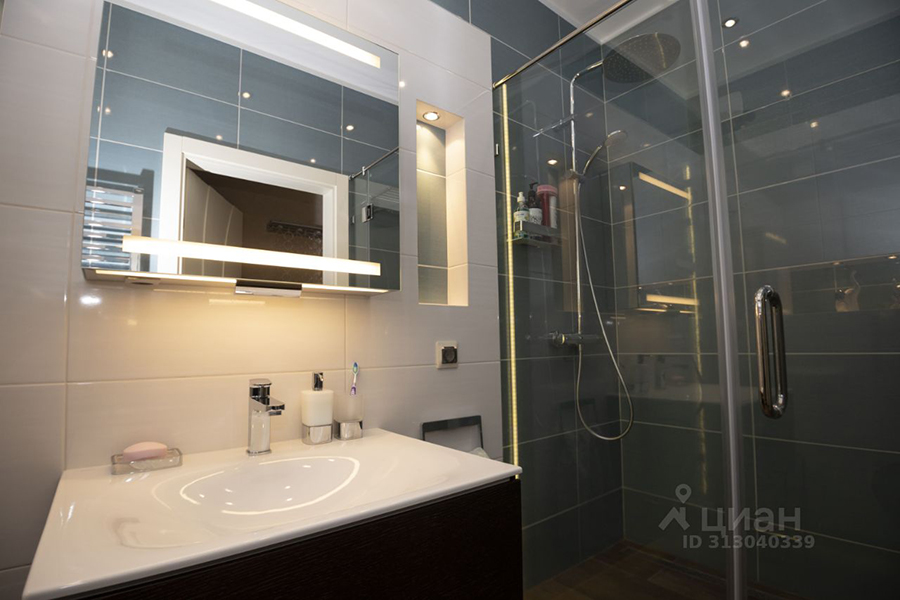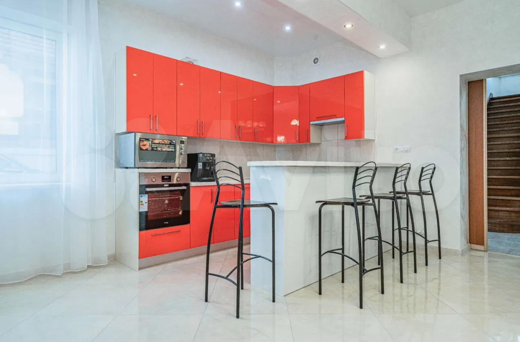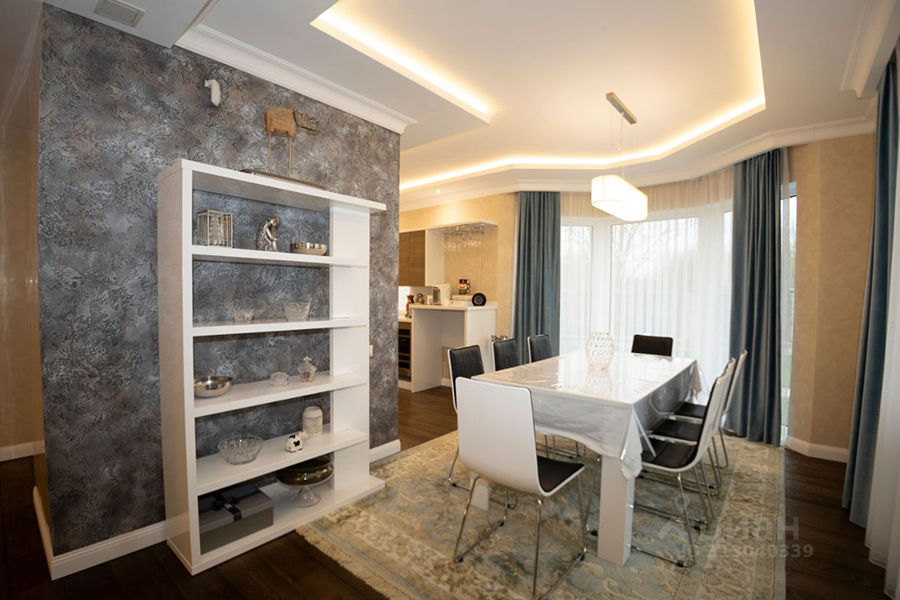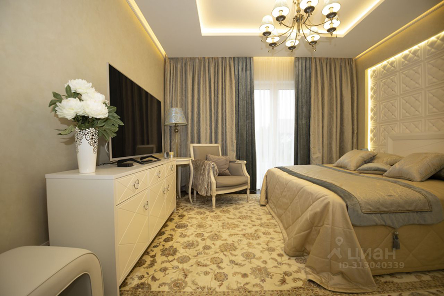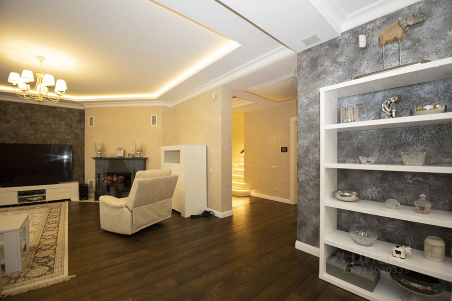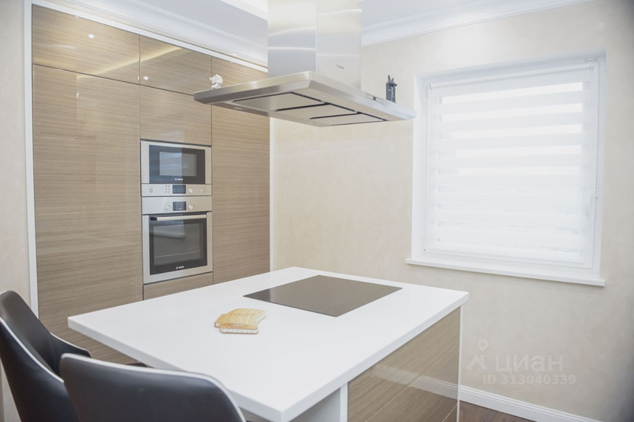 Из «техники от ведущих производителей» — холодильник, винный кулер, духовой шкаф, островная вытяжка, индукционная плита, посудомоечная машина, телевизоры и саундбары. Мебель — из Италии и Финляндии.