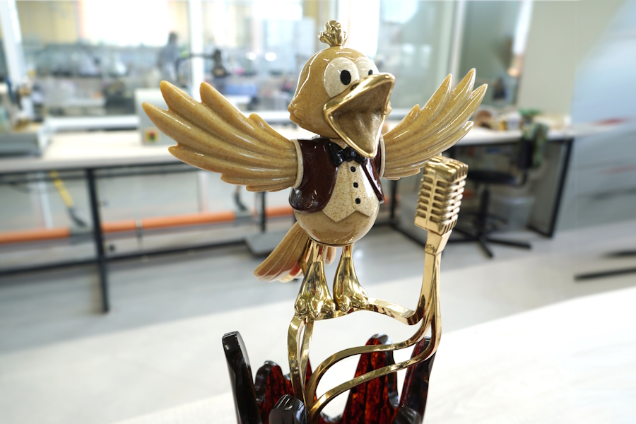 «При изготовлении статуэток художники использовали технологии прессования: под воздействием температуры и давления камню придали удобную для обработки форму и необходимый оттенок, сохраняя его природные свойства. Лапы, хохолок, клюв и микрофон сделаны из позолоченной латуни, поэтому сверкают и придают образу яркость и элегантность», — говорится в сообщении.