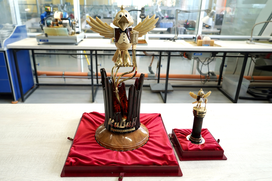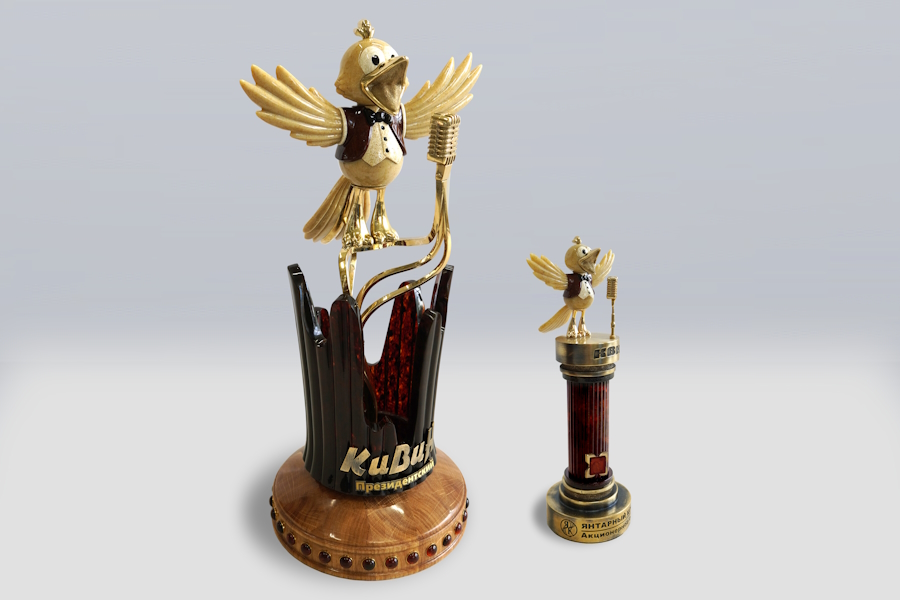 Главный приз для «Голосящего КиВиНа-2025» изготовлен в двух размерах: статуэтки высотой 45 см и 21 см. Каждая птица собрана из десятка янтарных элементов, самые маленькие из которых — пуговицы на жилете КиВиНа диаметром 2 мм.