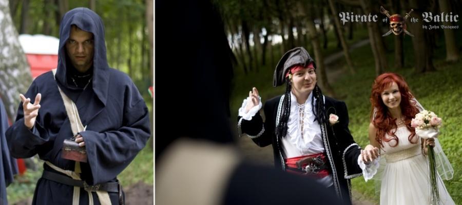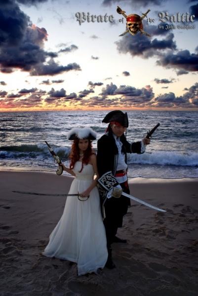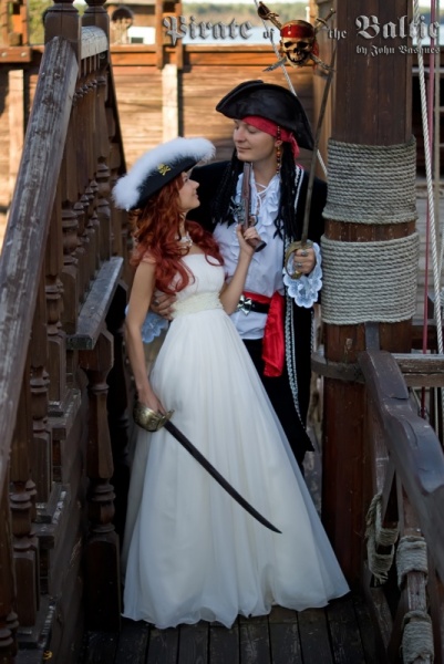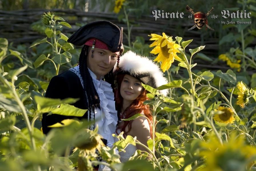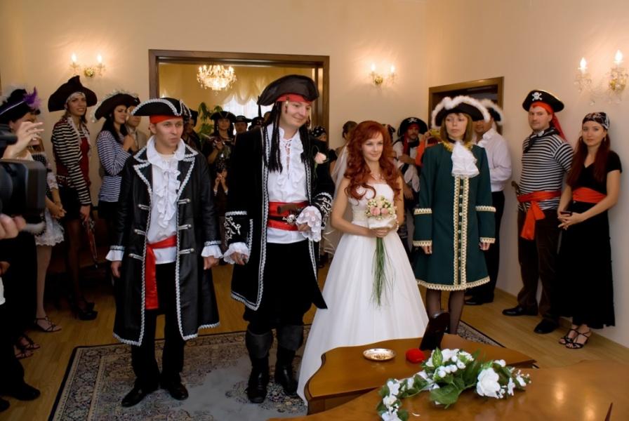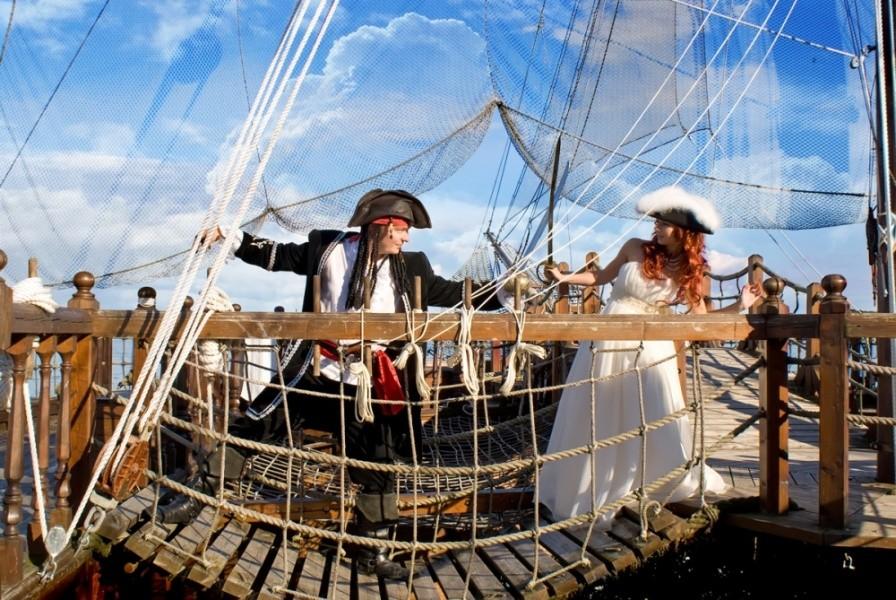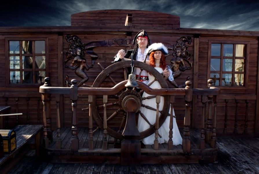 Это была самая настоящая, незабываемая и неповторимая ПИРАТСКАЯ СВАДЬБА! Капитан Алекс-Куница и его возлюбленная – дочь испанского губернатора, прекрасная Натали, решили отыскать остров Семейного Счастья, путь к которому доступен лишь искренне влюблённым. Но отец невесты был против этого путешествия и запер дочь в неприступном форту. Однако, капитан и его отважная команда пиратов-головорезов взяла штурмом форт губернатора, после чего все дружно отправились в путь. Для влюбленных Алекса и Натали не составило труда найти таинственный остров, где на берегу моря священник навсегда соединил их сердца под радостные возгласы друзей-пиратов и громкую пальбу самодельной пушки «Матильды». А продолжилось веселье на Тортуге, где до глубокой ночи раздавались крики «На абордаж!» (вместо «Горько»), «Йо-хо-хо!» и «Выпьем рому за молодых!». Результат сего путешествия не заставил себя долго ждать: через 9 месяцев на свет появились пиратики-двойняшки Даниил и Евгений.