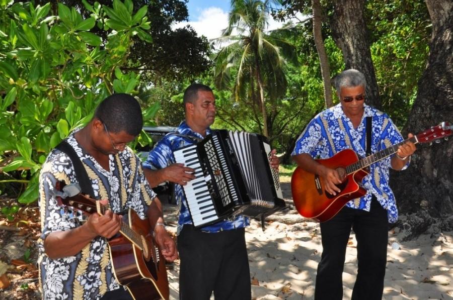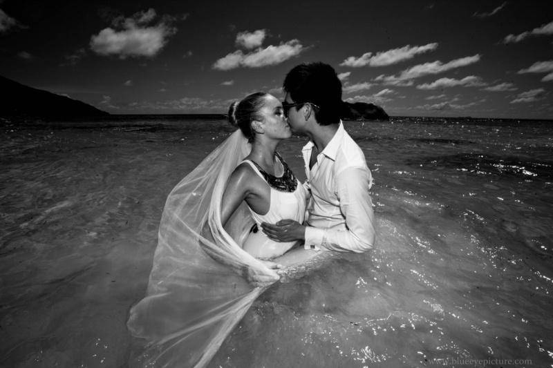 Океан, арка из цветов, местные музыканты, кольца на листиках, улыбающиеся люди вокруг. Все так естественно и легко! После всех церемоний забежать в свадебных платьях в теплый океан – это рай! Как раз во время фотосессии в воде мимо проплыл огромный скат)