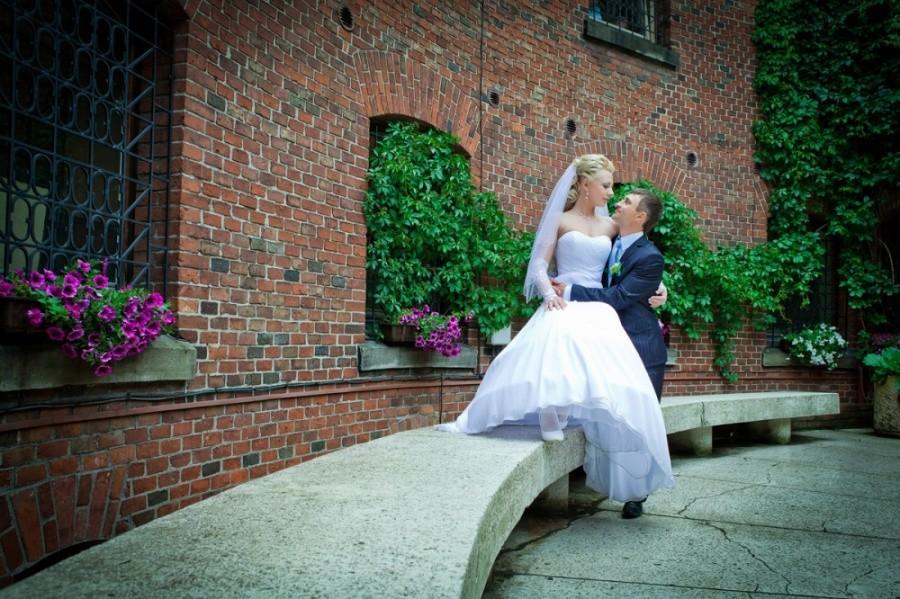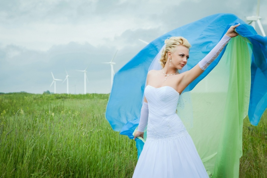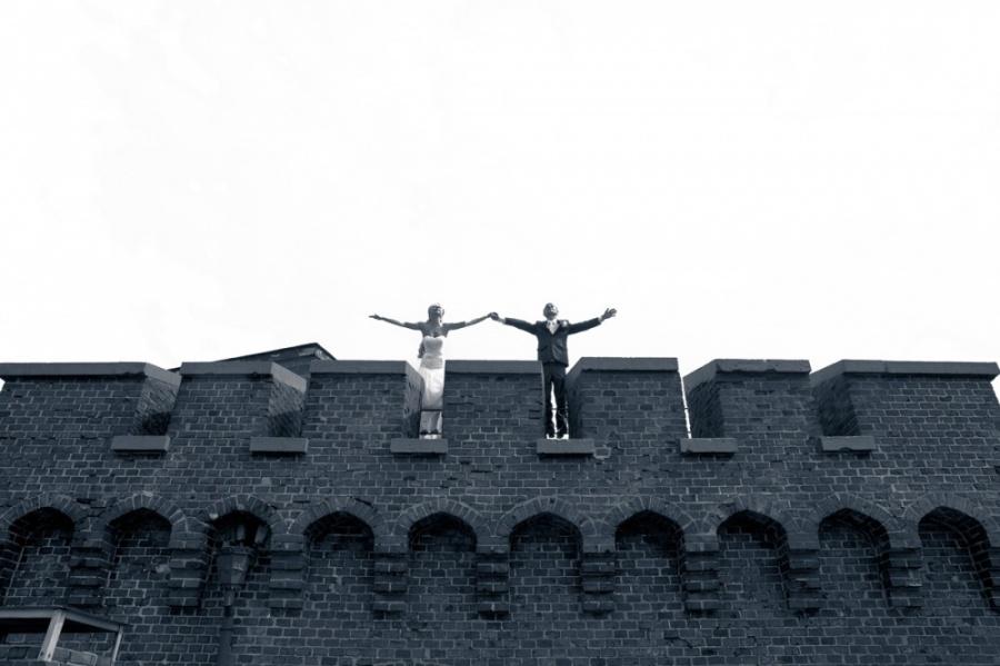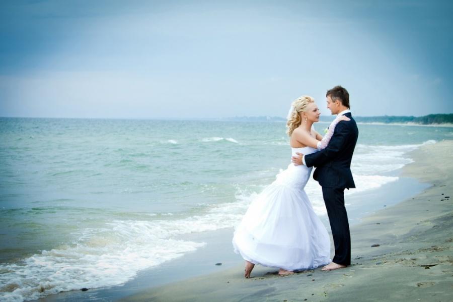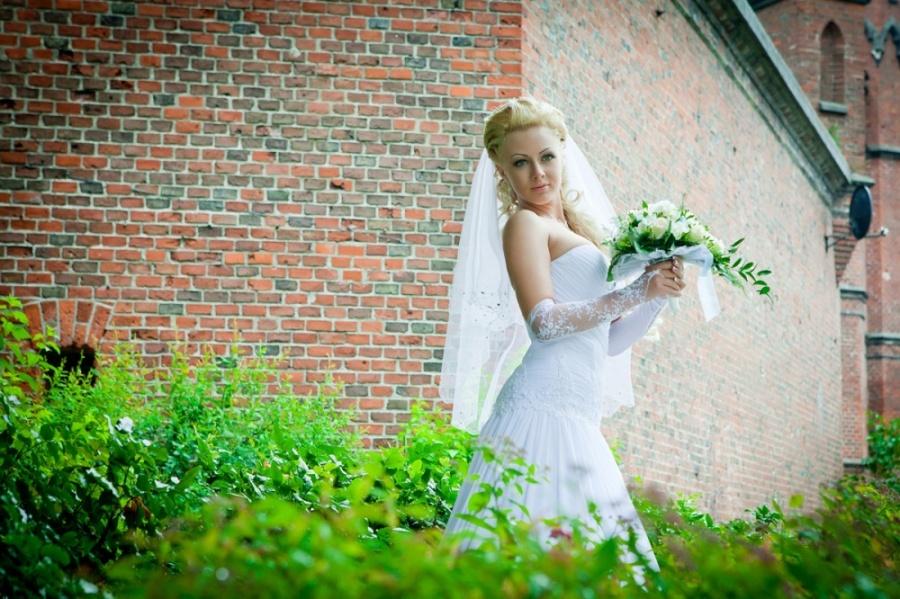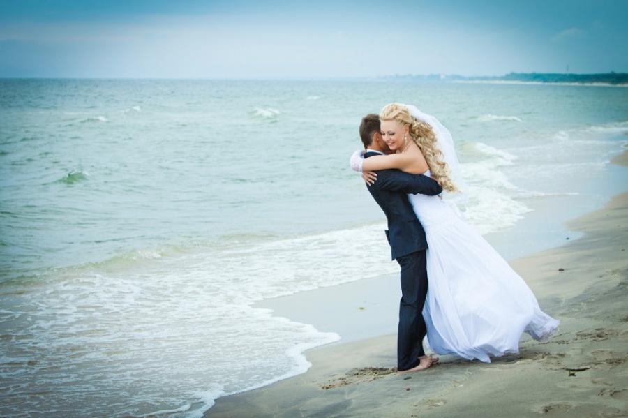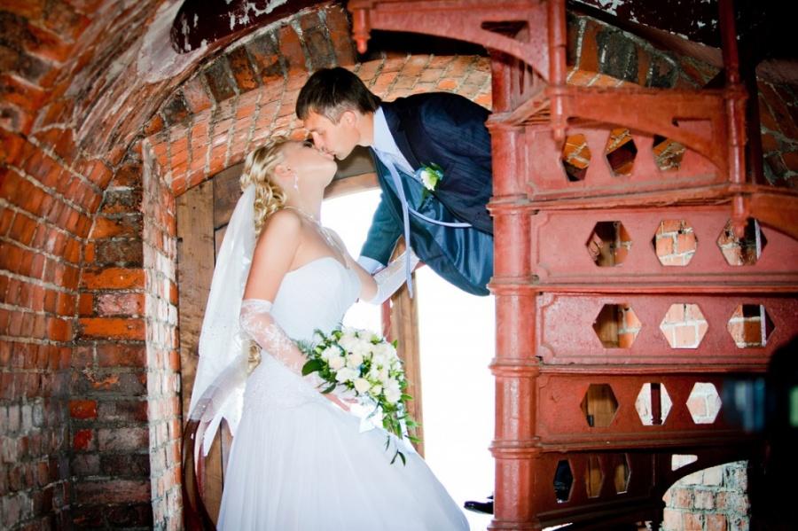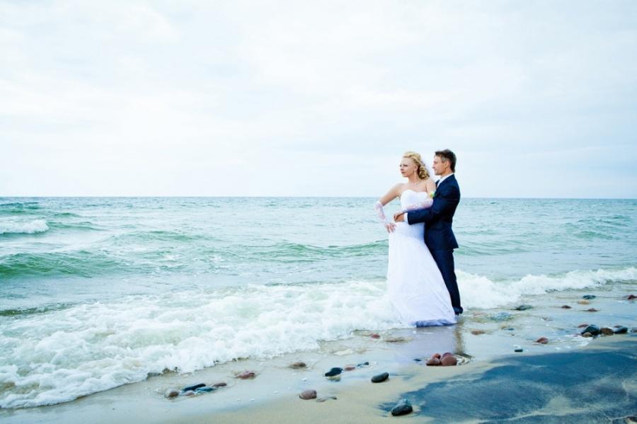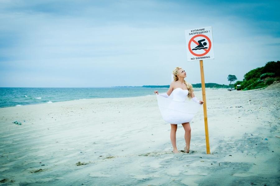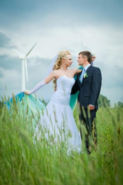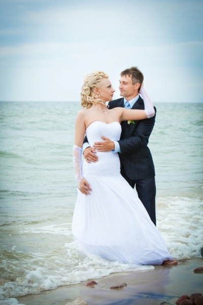 Выходим и едем на фотоссесию, погода разыгралась и уже светило солнце. Мы изначально не хотели, чтобы наши фото были как у всех и поэтому стандартный набор калининградских молодоженов и их любимых мест для фотосъемки для нас «отпал». Первым в списке мест для фото был Музей янтаря, фотографировались во внутреннем дворике и даже забрались на крышу. Так как наш город расположен на берегу Балтийского моря, мы туда и отправились. По пути остановились и повесили замок на трассе (на нем была надпись «Верим в любовь с первого клика»). Приехав, пофотографировались в поле возле ветряков, затем спустились к морю. Вот тут и началось все самое интересное, сначала пару снимков возле моря, а потом мы зашли в воду, которая была ледяной. Платье после поля и лазанья по крыше музея было грязным, девочки фотографы помогли мне его отстирать и привести в более менее нормальный вид. Ведь потом нас ждала выездная регистрация, которая проходила в ресторане. Мы должны были выглядеть с иголочки, на свадьбе было 130 приглашенных. По пути в ресторан я сушила платье прямо в автомобиле. В ресторане все прошло замечательно, спасибо нашим ведущим за организацию.