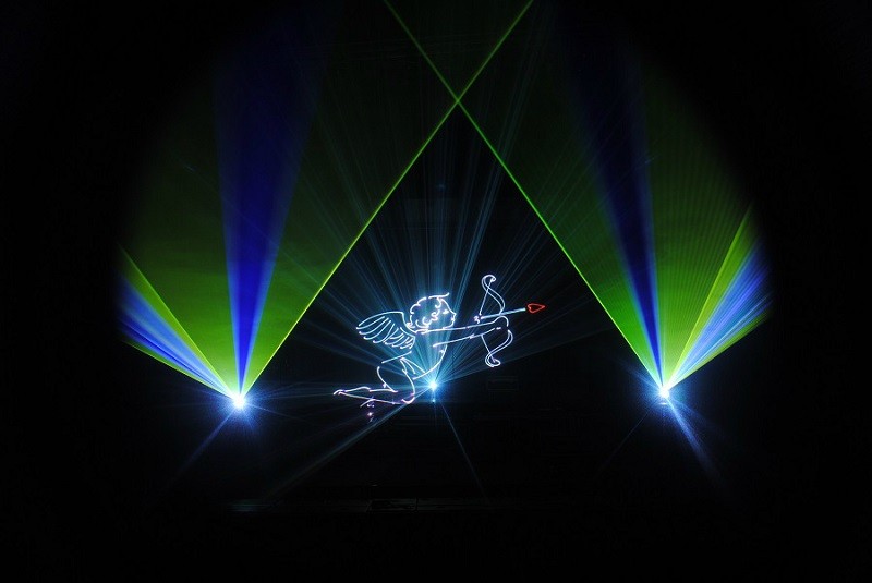 Лазерные лучи проецируются в тумане, благодаря чему возникает нереально красивый объемный эффект. В отличие от остальных обезличенных программ лазерное шоу позволяет персонализировать выступление (нарисовать имена, и портрет молодых) или рассказать целую