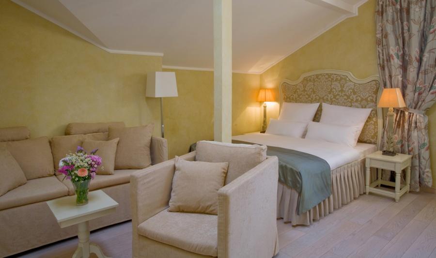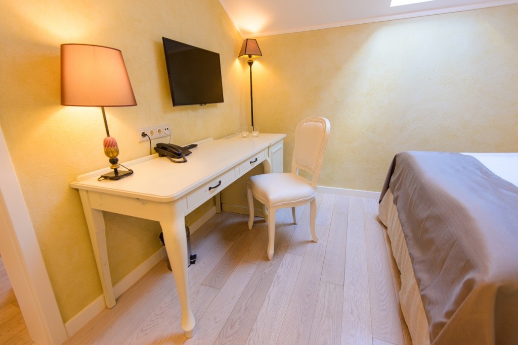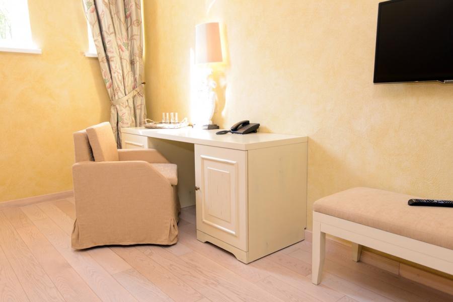 Номера категории «Полулюкс» оформлены в индивидуальном стиле и имеют площадь от 25 кв. м. до 36 кв. м. Спокойный классический интерьер выполнен с использованием новейших технологий и радует глаз гостей.