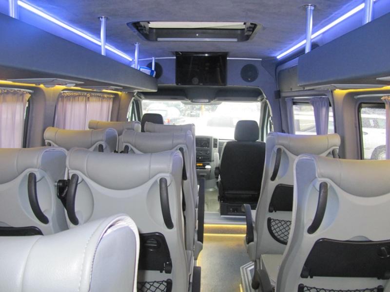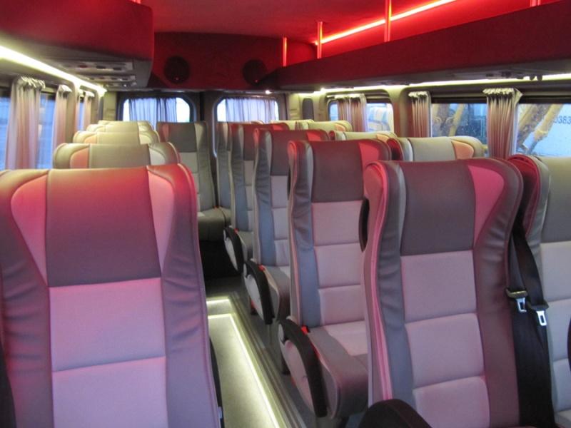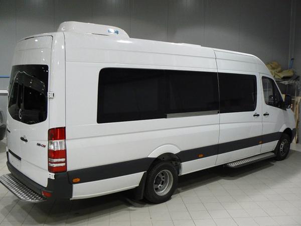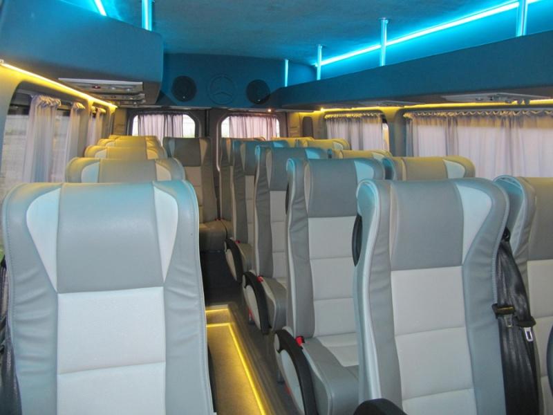 Mercedes Sprinter Long класса Luxe повышенной комфортности — 19 мест. Туристического типа. Светлый кожаный салон + алькантара. Кондиционер, CD, TV, DVD. Откидные сидения из комбинированной кожи, светодиодные подсветки.