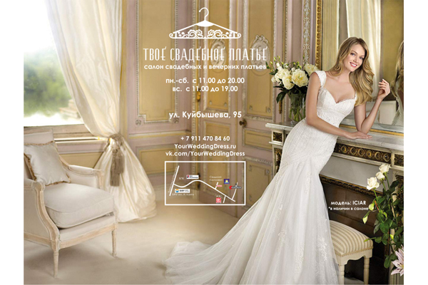 Вам не придётся ехать за границу, чтобы найти роскошный наряд для главного торжества в вашей жизни. Большой выбор свадебных и вечерних платьев европейских марок представлен в салоне «Твое свадебное платье». Салон является официальным дилером ведущих брендов испанской свадебной моды: «La Sposa», «Atelier Diagonal», «Avenu Diagonal», «It’s my party», «Dublos», «Accessorias» и «Daria Karlozi». Именно поэтому цены на платья, представленные в салоне, определяются производителем и едины по всей Европе, в том числе одинаковы с ценами в Польше и в Литве. Внимательный консультант салона покажет коллекции и посоветует подходящую вам модель платья. Вы сможете примерить ее с соответствующими аксессуарами, которые также представлены в салоне. Для покупателей действует гибкая система скидок.